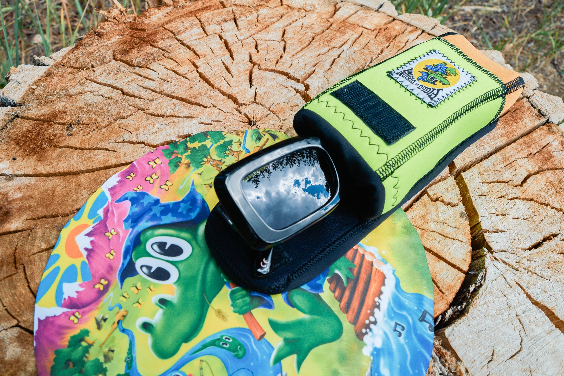 Each pair is packaged with a circular lens cloth featuring the original Field of Vision poster artwork and a custom upcycled neoprene pouch made from offcuts supplied by Rip Curl’s wetsuit factory. No two pouches are the same, and each one comes with a branded carabiner so you can clip it to your belt or bag while you’re out roaming the field.